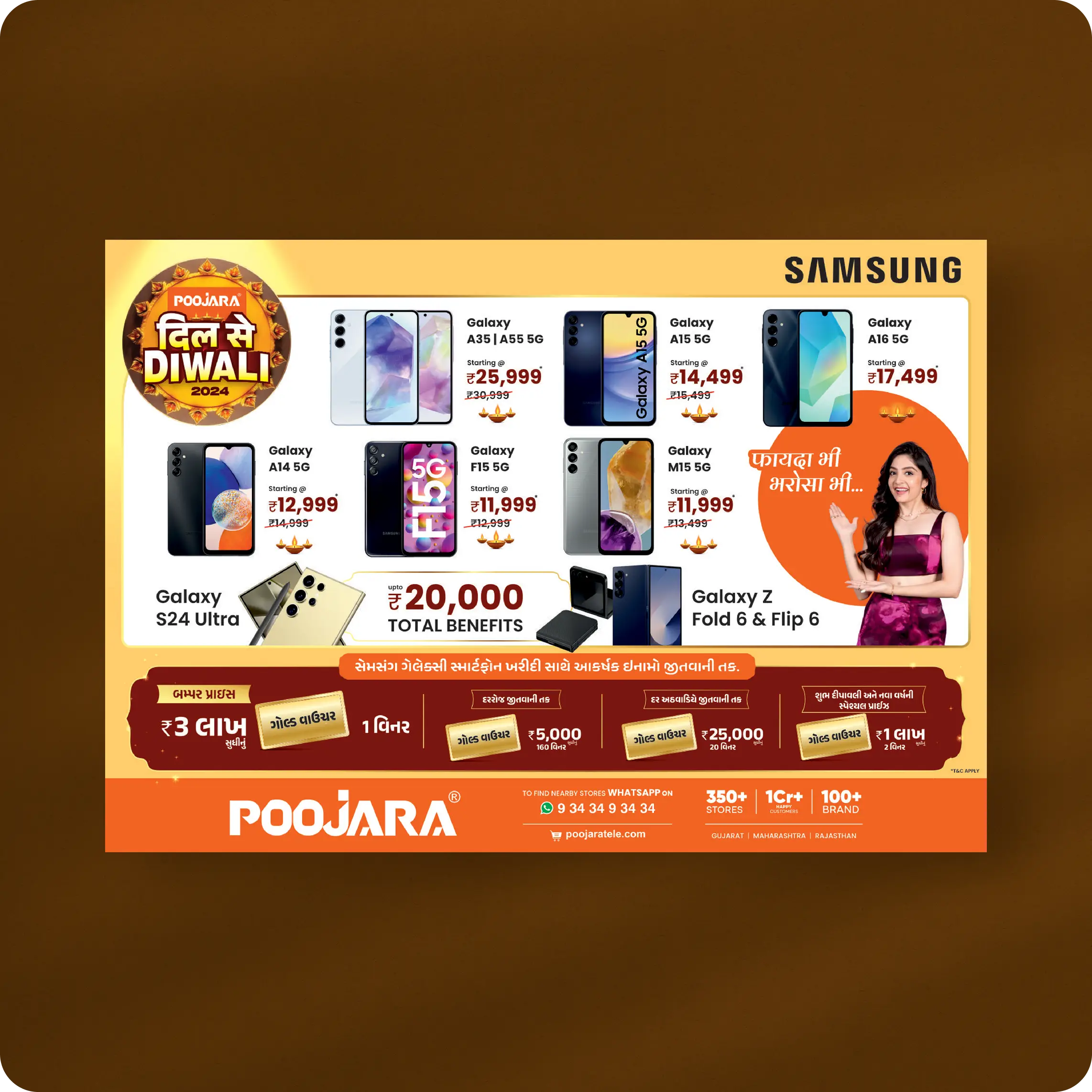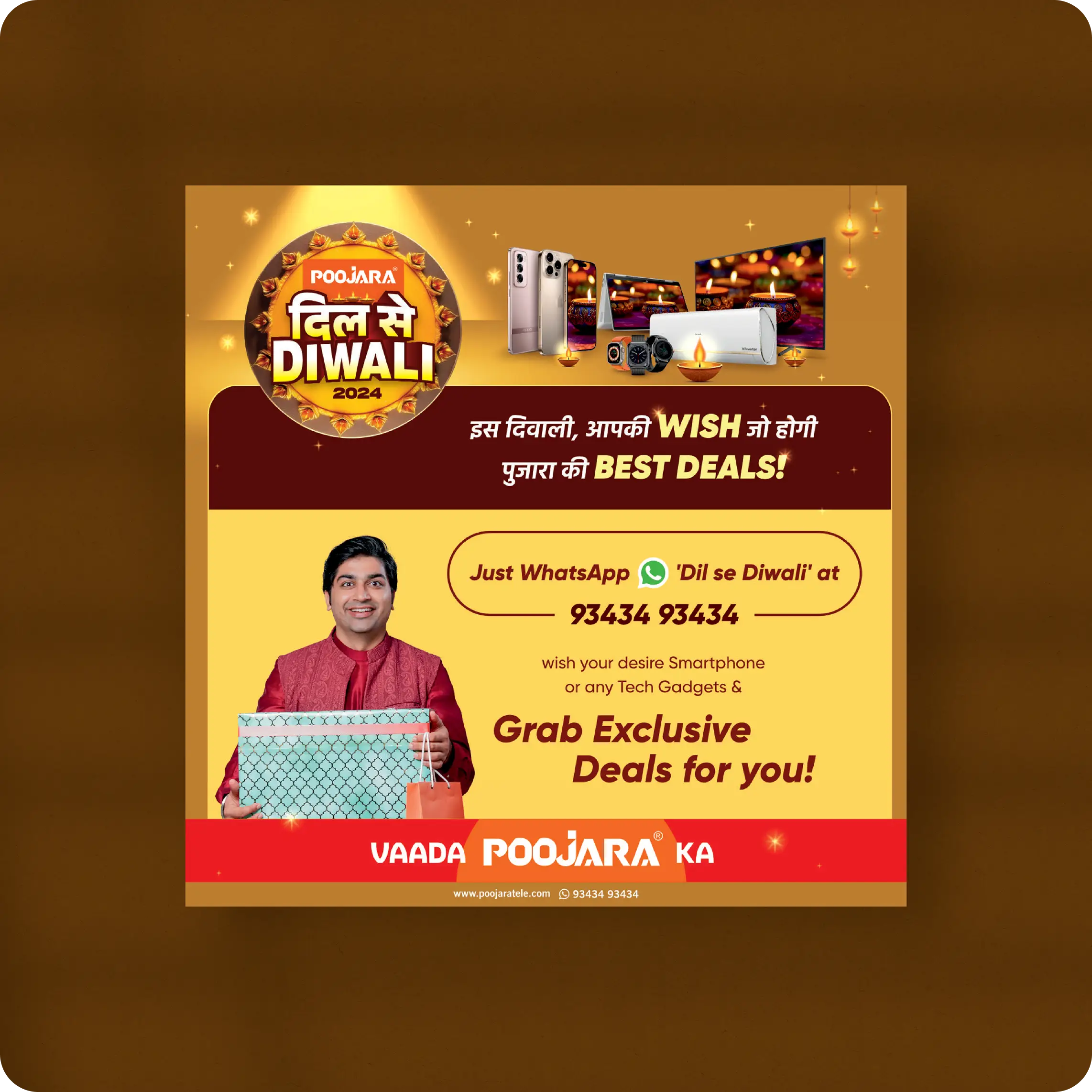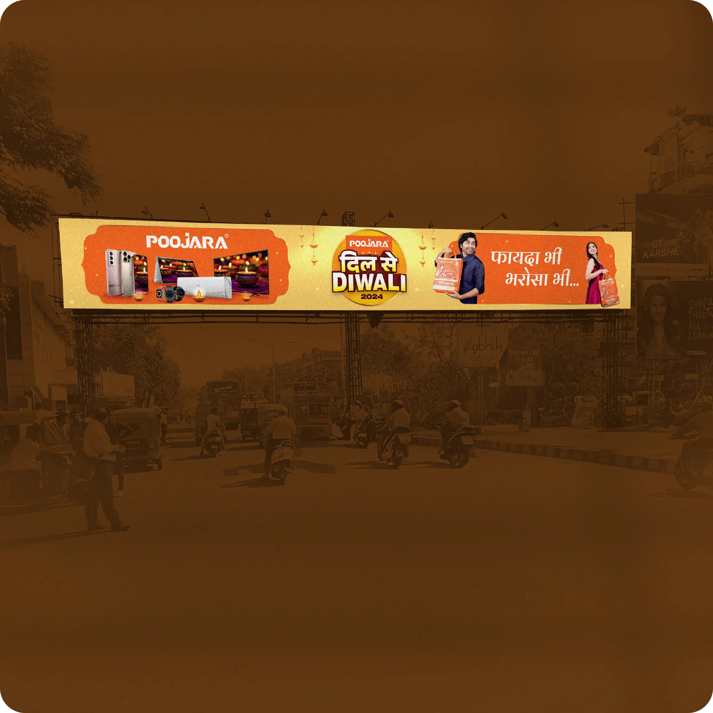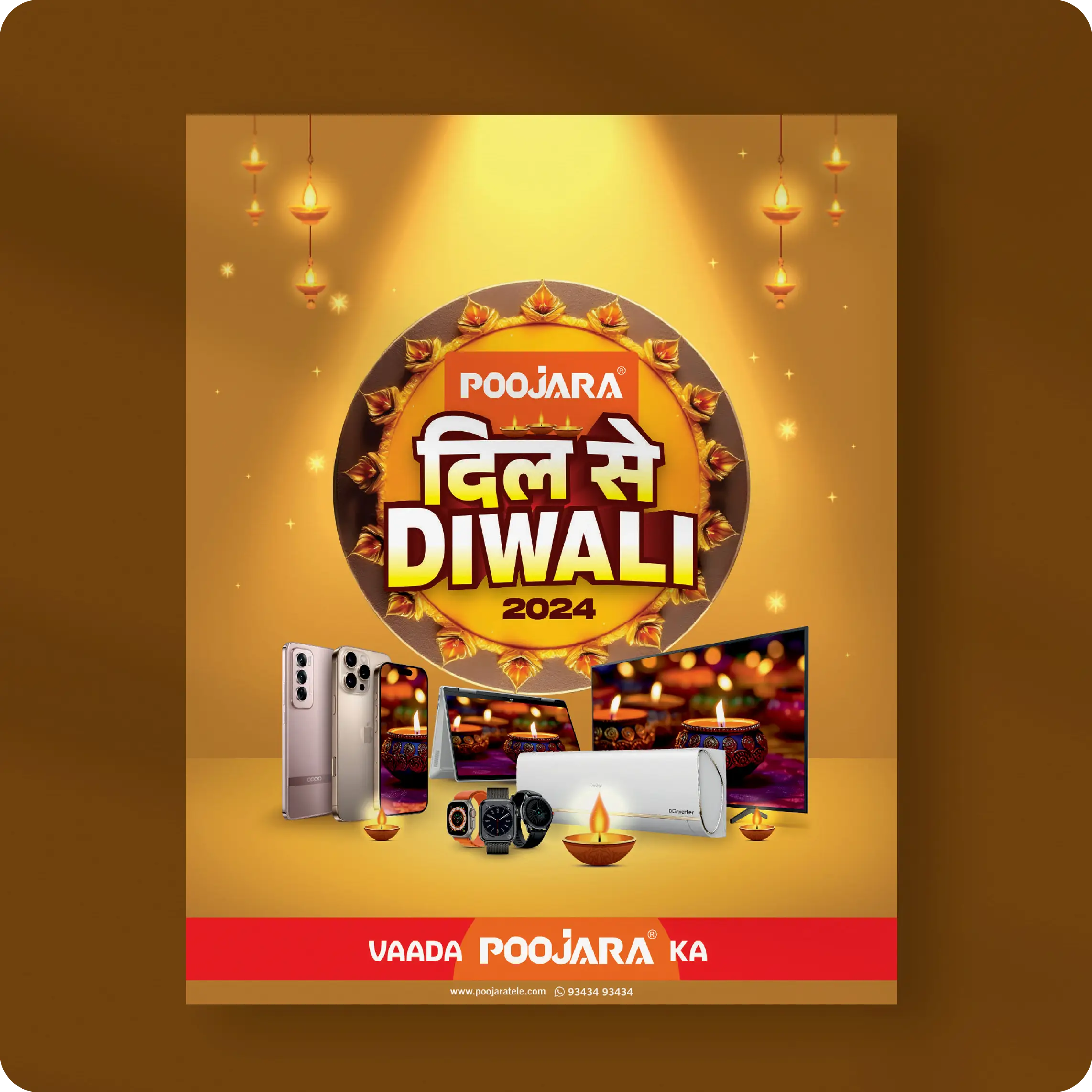 OuttaBox partnered with Poojara Telecom to create the “Dil Se Diwali 2024” festive campaign, designed to highlight exclusive offers, brand partnerships, and customer rewards. The goal was to deliver a festive visual identity that combined excitement, trust, and local cultural connect.